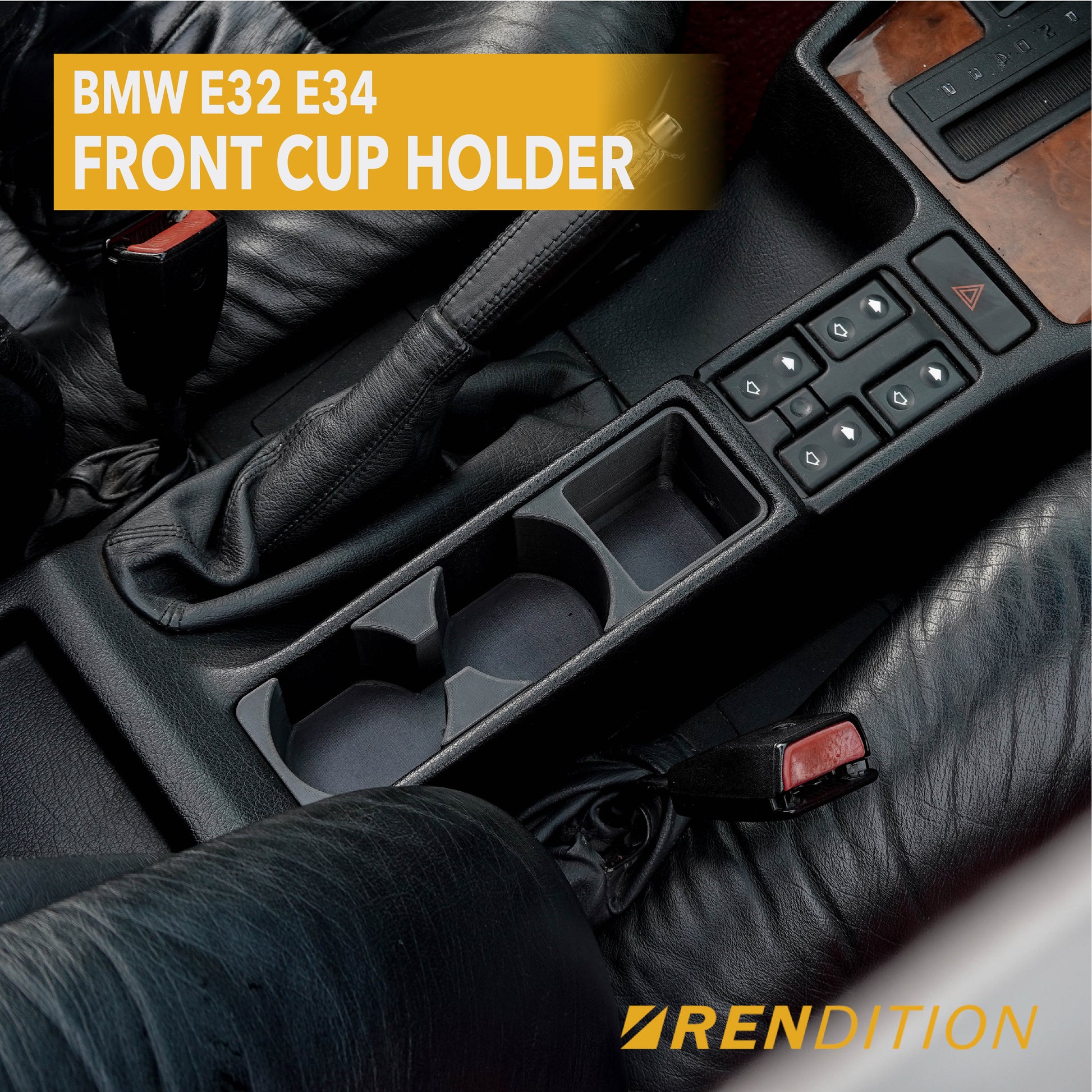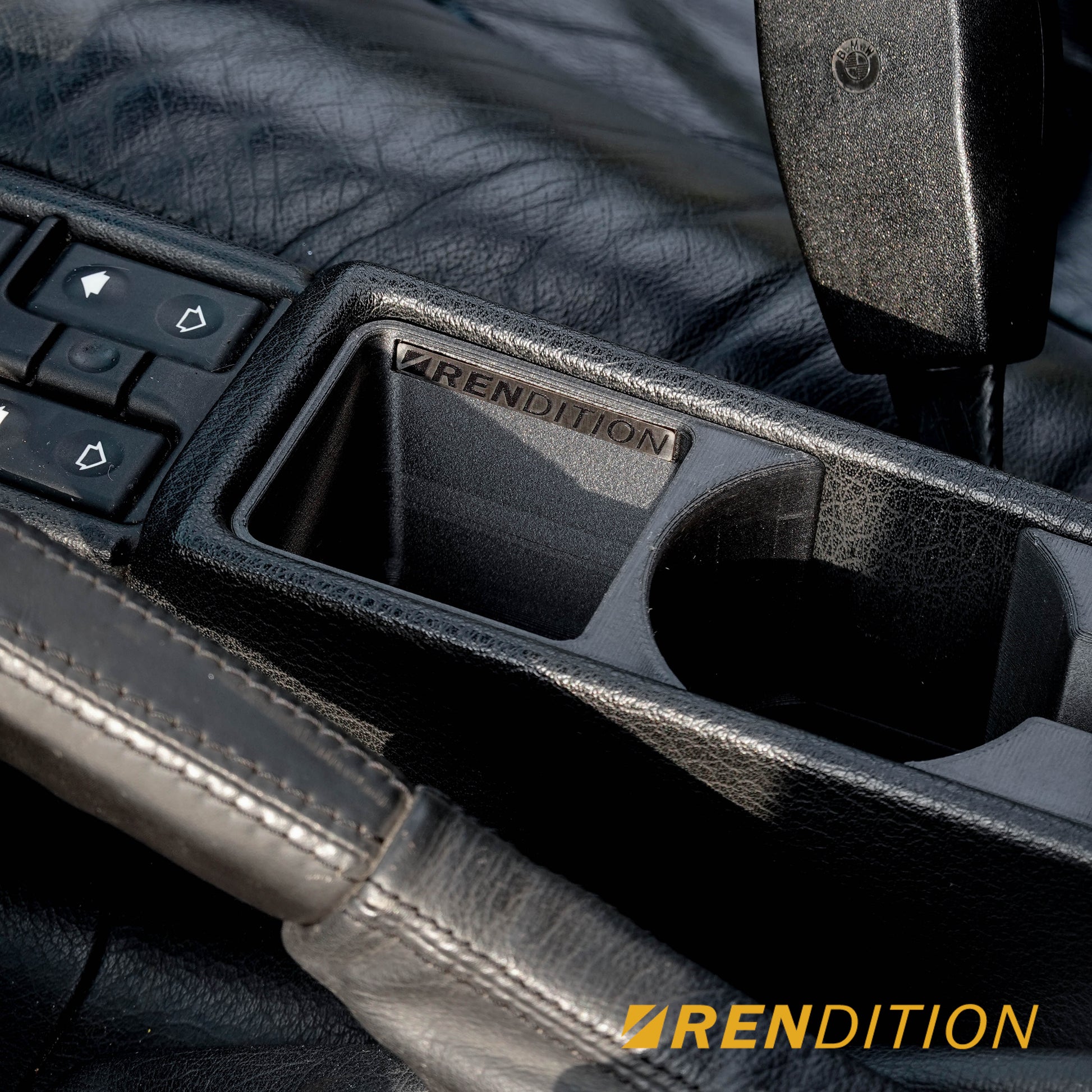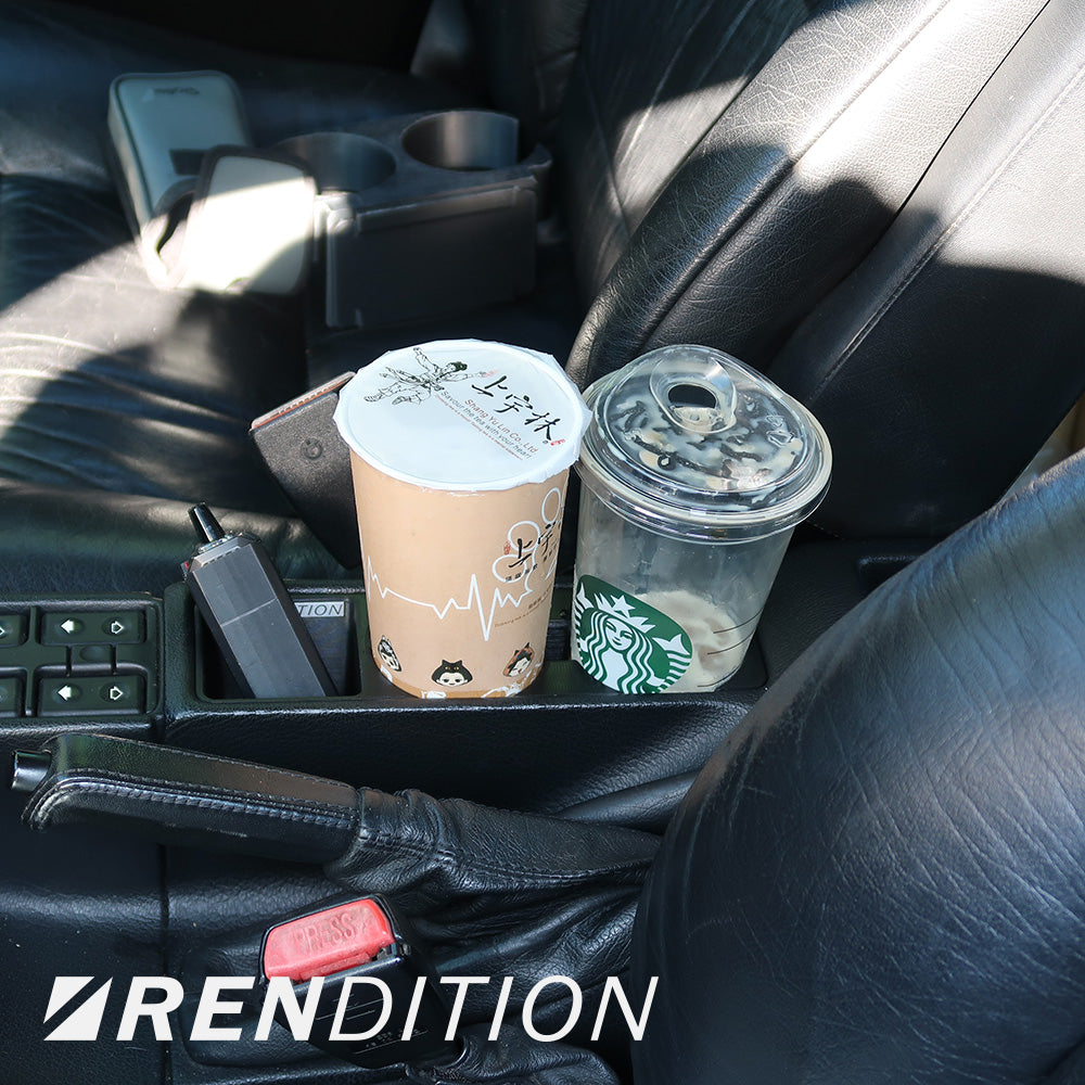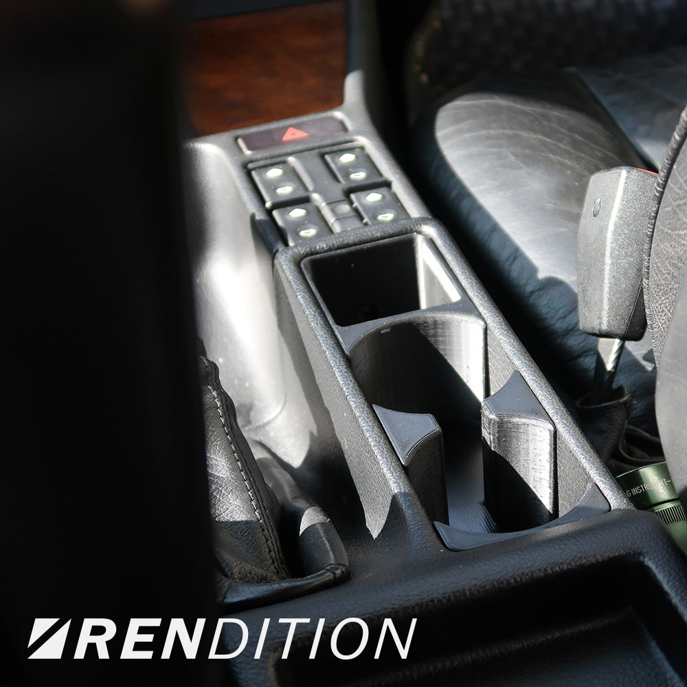 Introducing the Rendition E32/E34 Cup Holder – the perfect upgrade for your BMW E32/E34 interior. With a 69mm diameter it securely holds most PET bottles and coffee cups, plus an additional storage compartment. The unique central opening accommodates larger containers while maximizing space for other items. The installation uses original mounting points, so no drilling or modifications are needed.