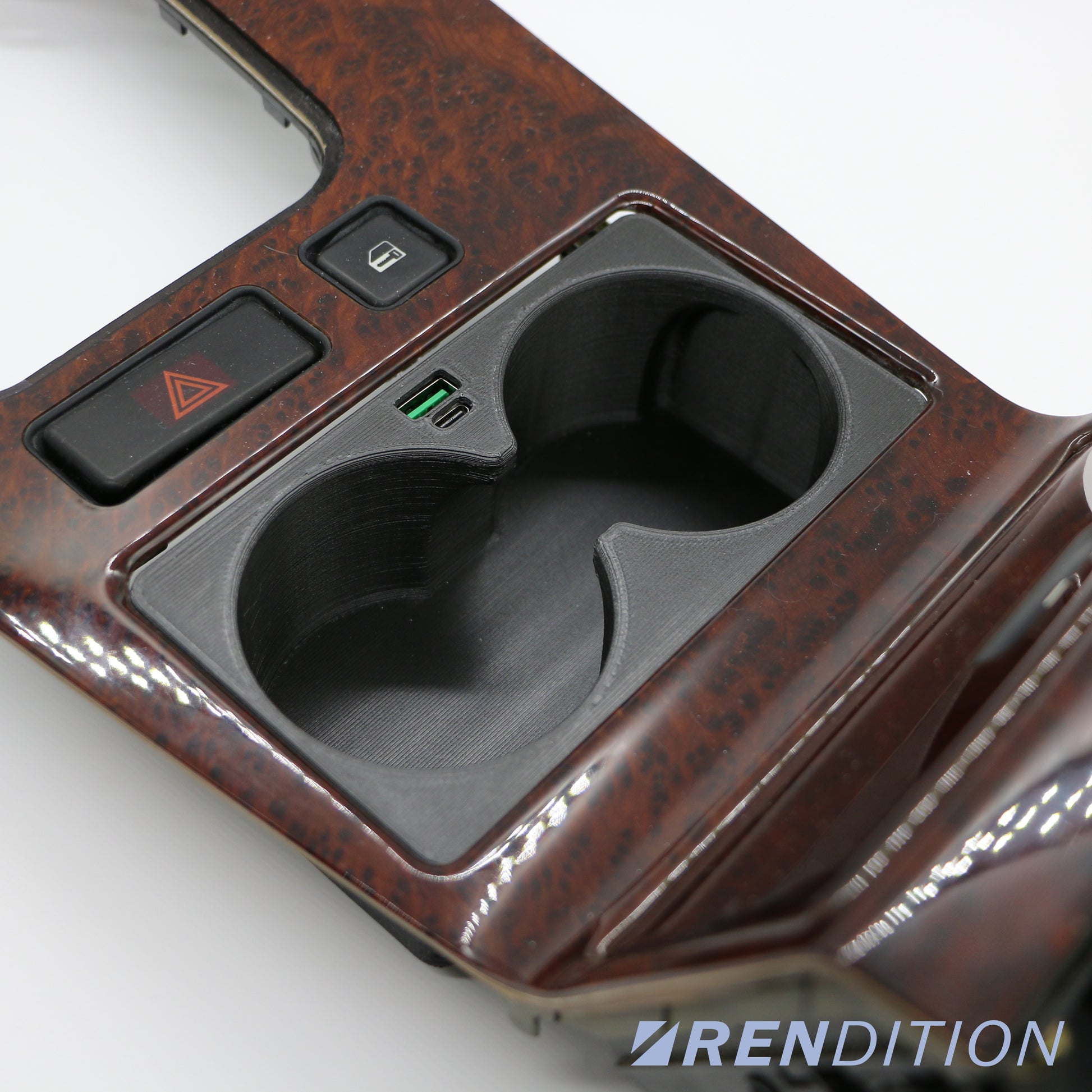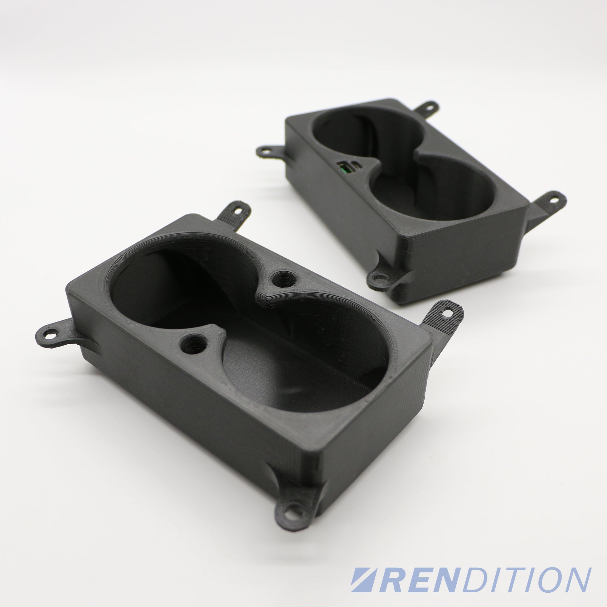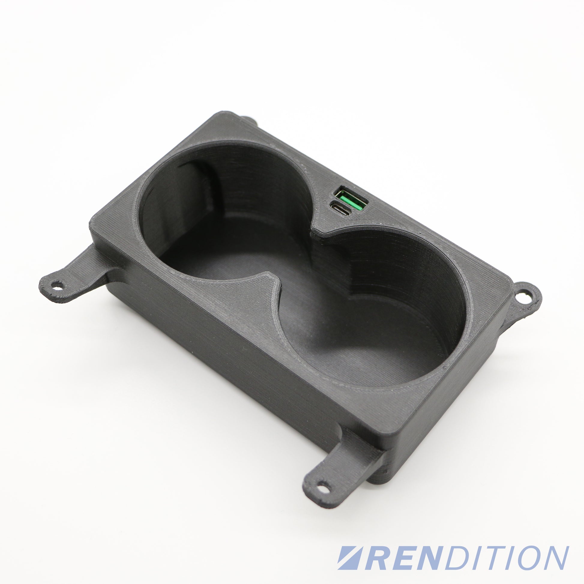 A comprehensive E38 cup holder solution that also adds USB charging capability to your E38 7-Series. Featuring two 70mm cavities to hold most bottles and coffee cups, it incorporates a space-optimized design for more storage.