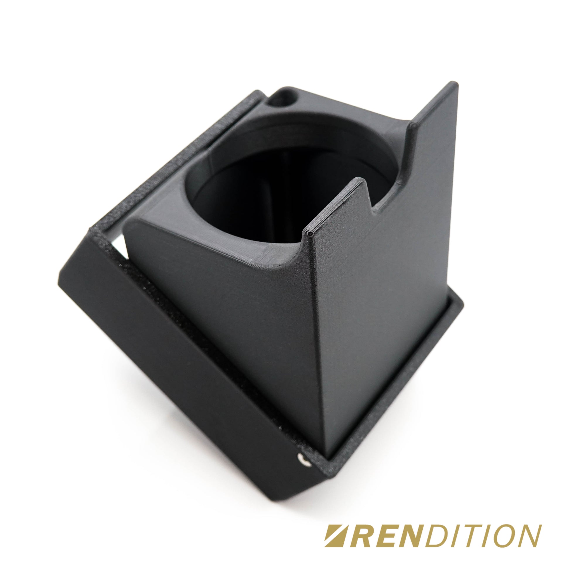 This Rendition BMW E39 front cup holder features a 70mm diameter hole to fit most drink containers and includes a small compartment for additional storage. It can easily replace the OEM front tray by simply popping it out and installing the new cupholder.